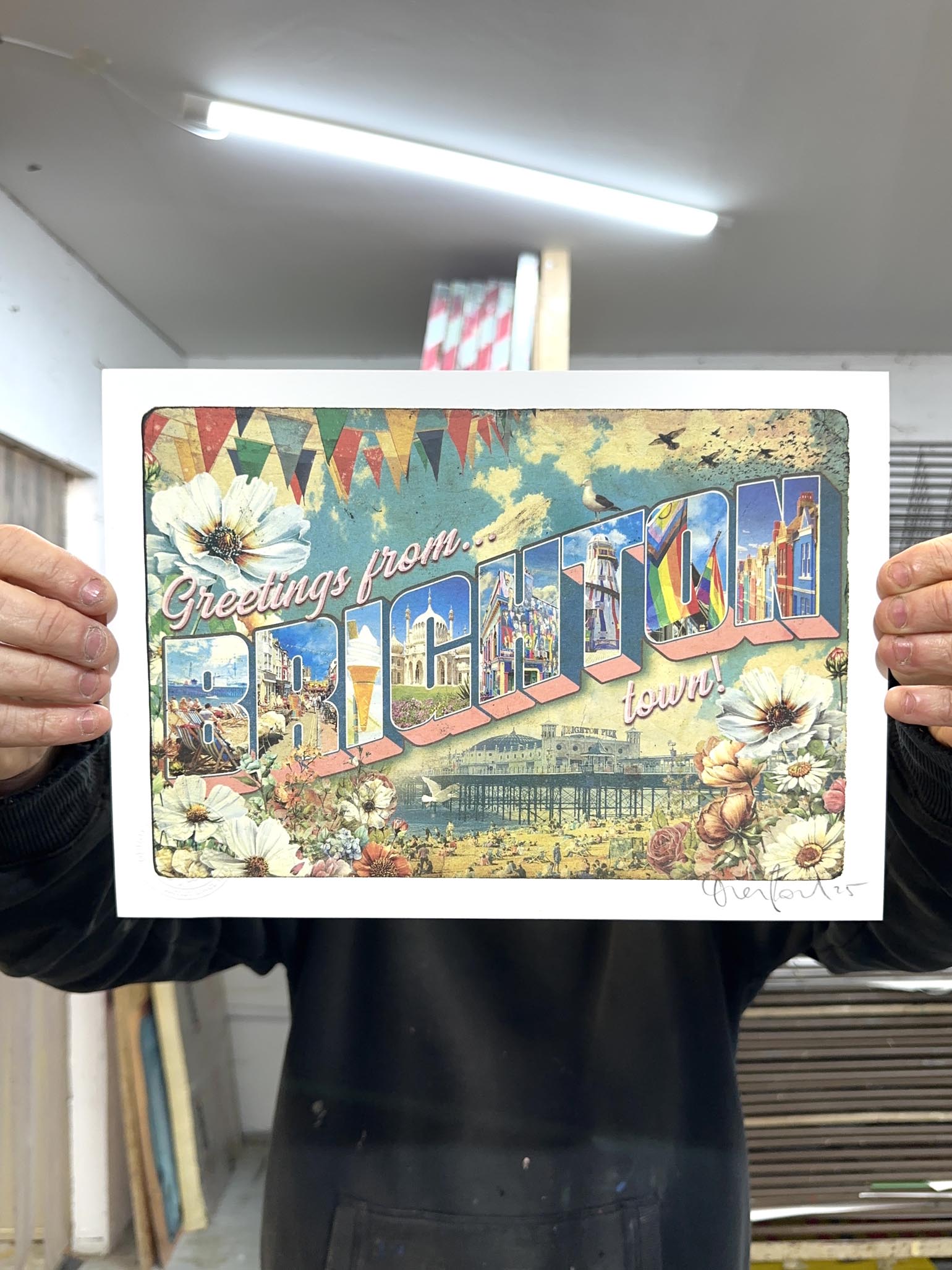 Brighton's energy captured through its landmarks - the Pavilion, the Pride flag, the seaside spirit. Vintage postcard style meets modern collage.