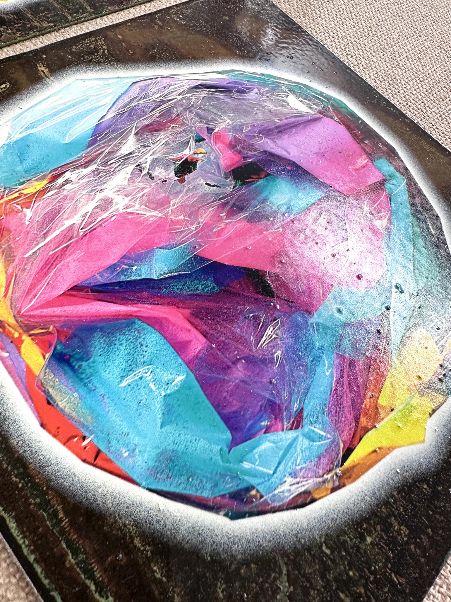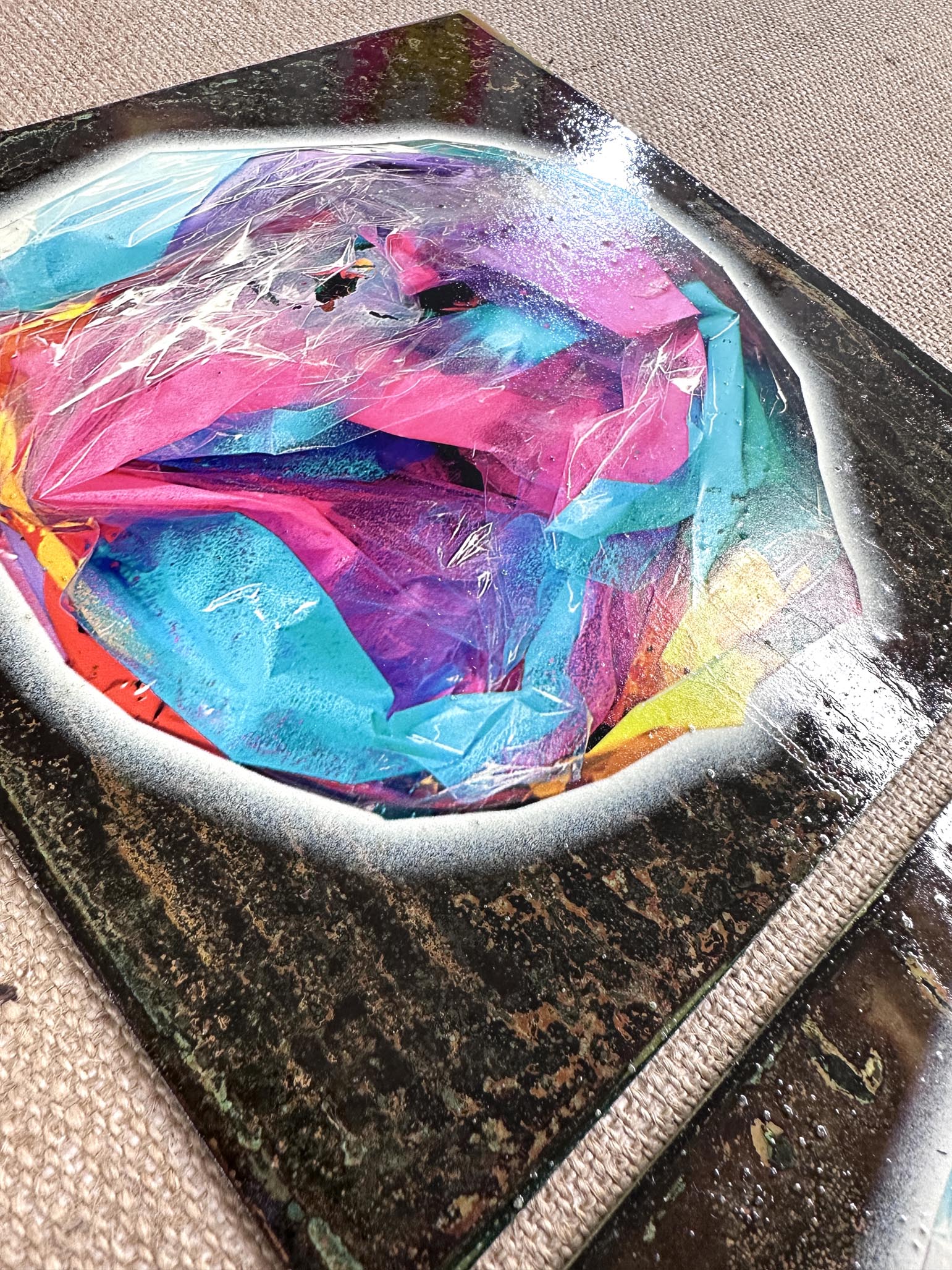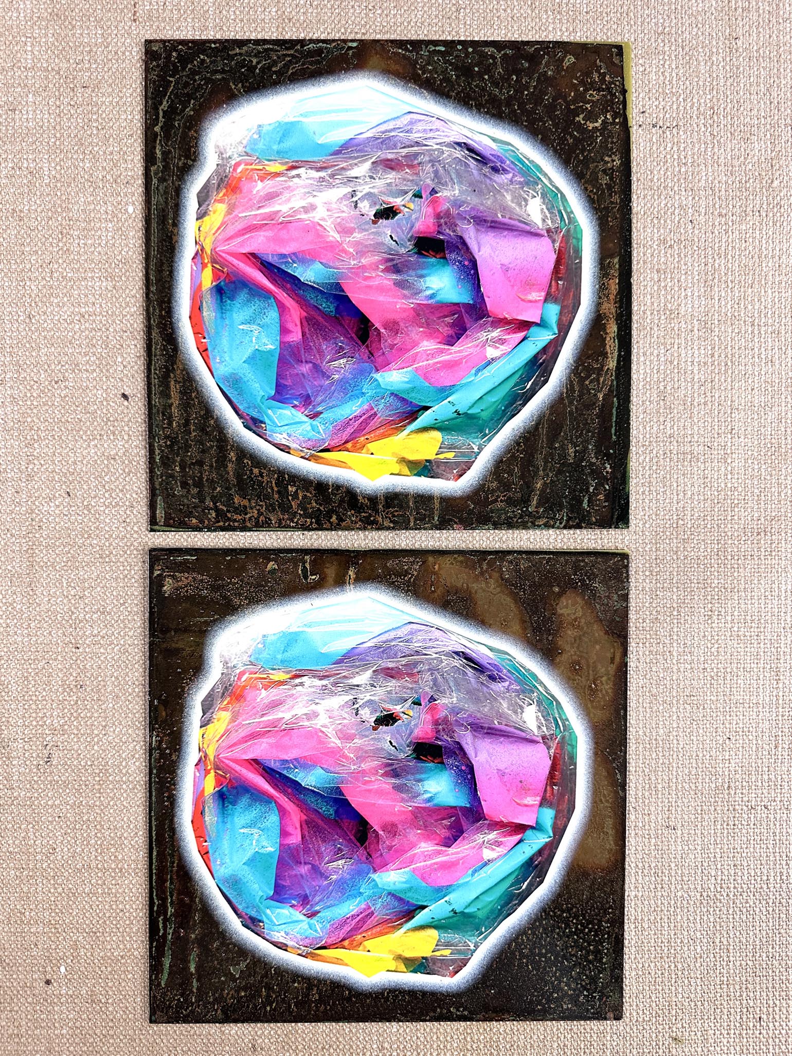 One-off original on oxidised copper with printed abstract composition and varnish overlay. 250 x 250mm. Signed by artist on the back.