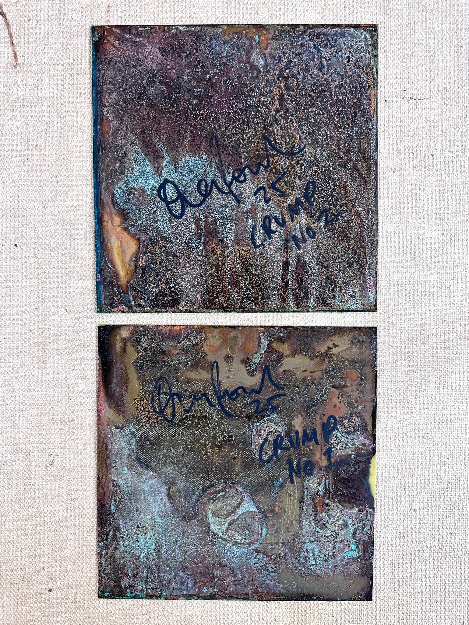 Abstract composition on oxidised copper. The patina creates a unique background that shifts with time, while the printed elements add layers of visual interest.