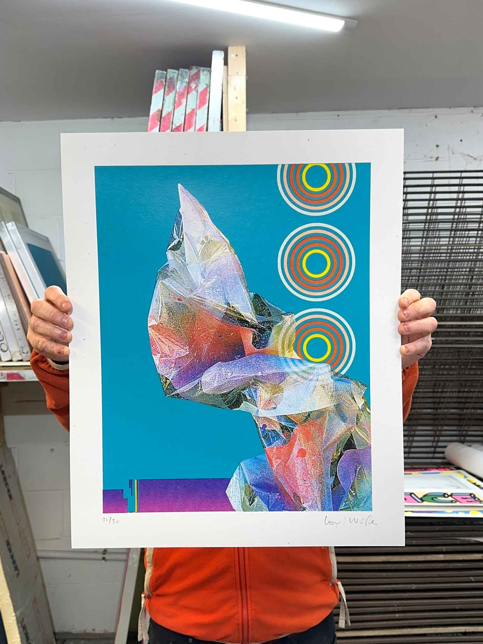 5-layer CMYK dither hand-pulled screenprint based on abstract shapes created from spray painted cellophane. 380 x 450mm, 400gsm Cairn Ivory paper. Limited edition of 30, signed and embossed. Sold unframed.