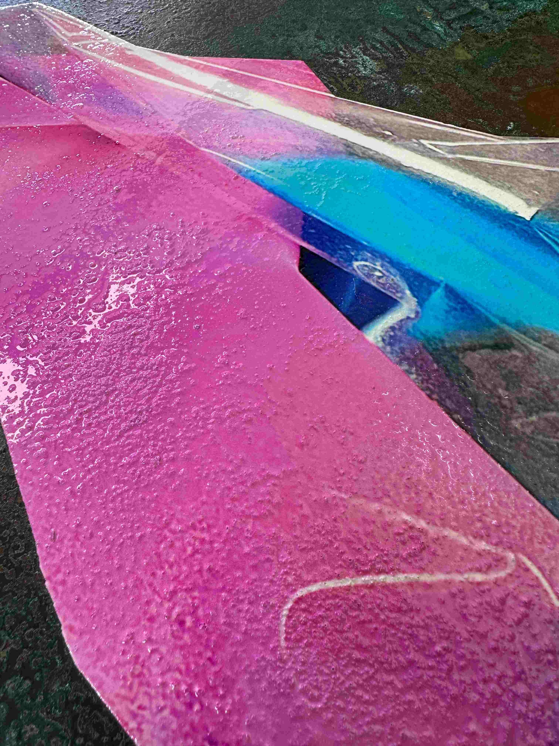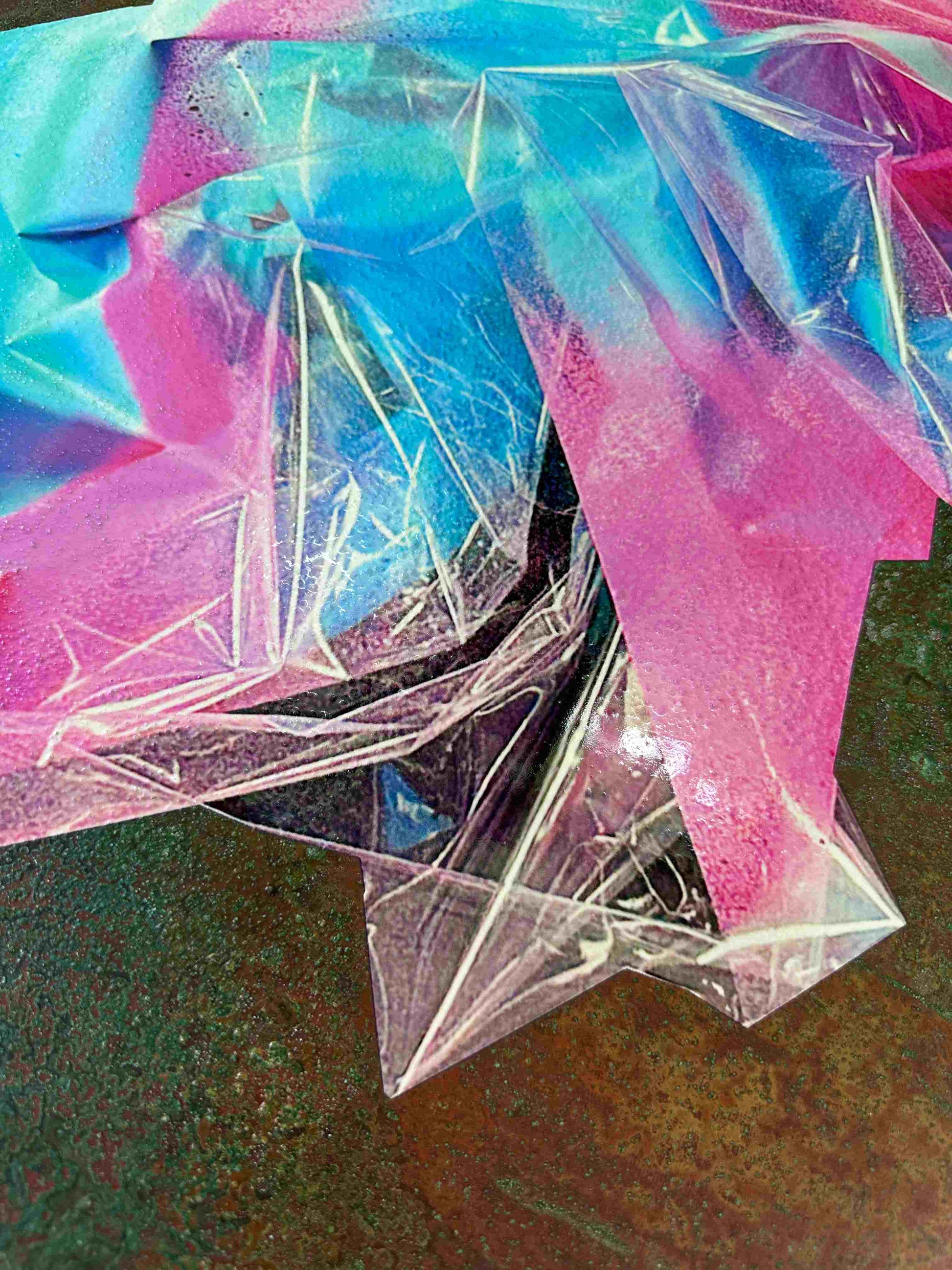 Cellophane plastic transformed into abstract alien landscapes. This large-scale piece explores otherworldly forms through spray paint and oxidised copper.