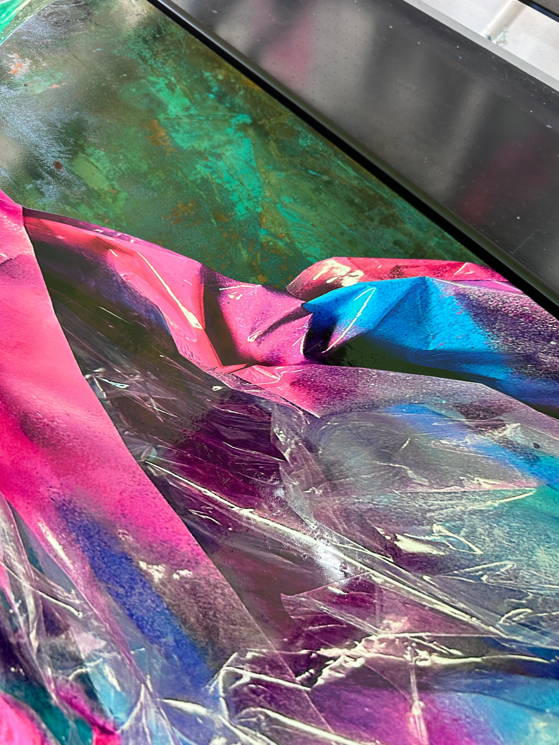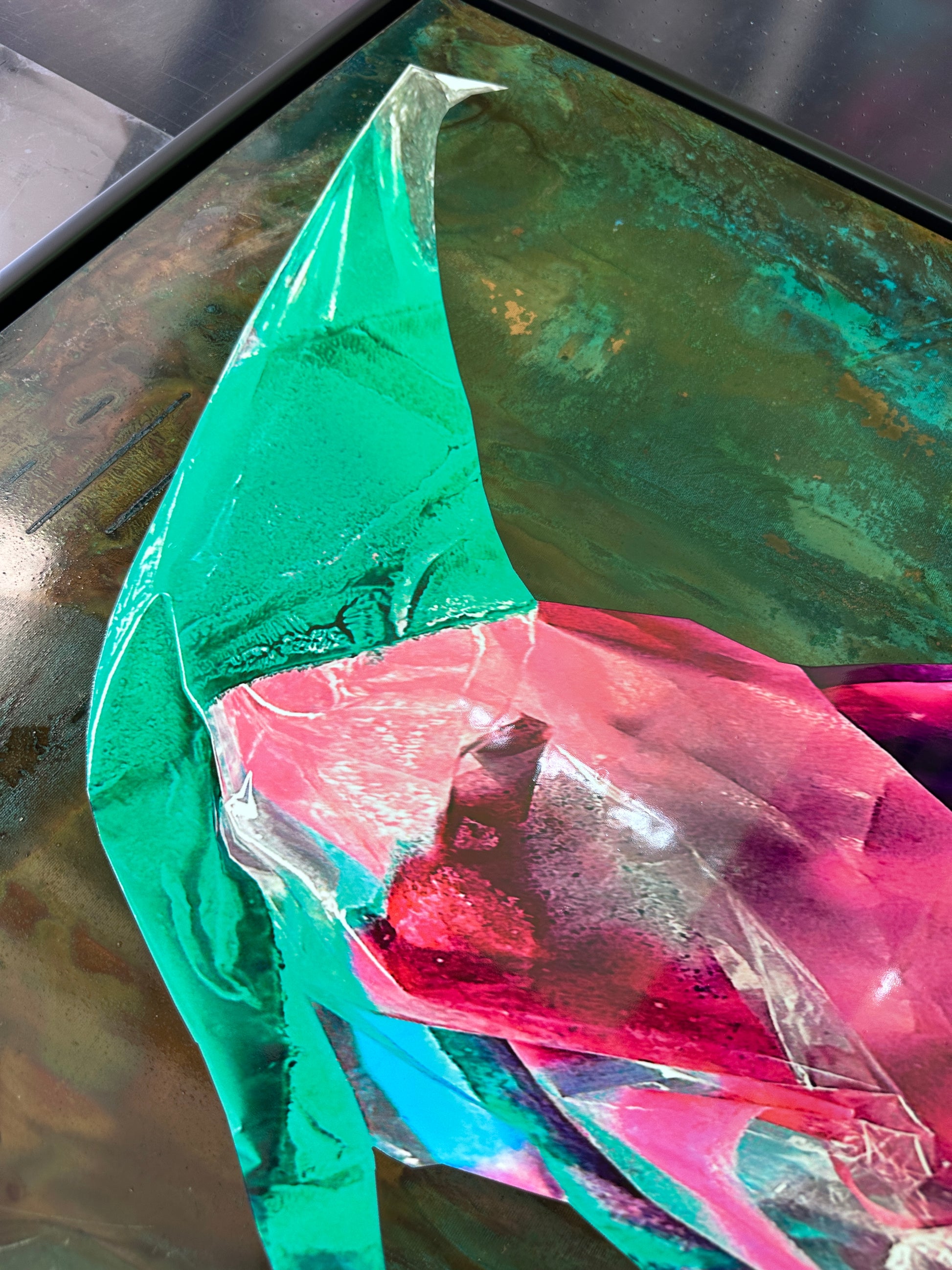 Cellophane plastic transformed into abstract alien landscapes. This large-scale piece explores otherworldly forms through spray paint and oxidised copper.
