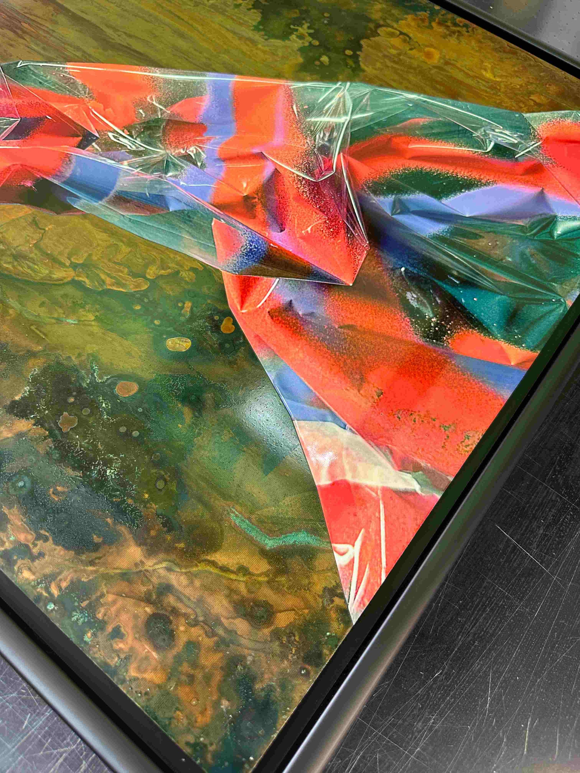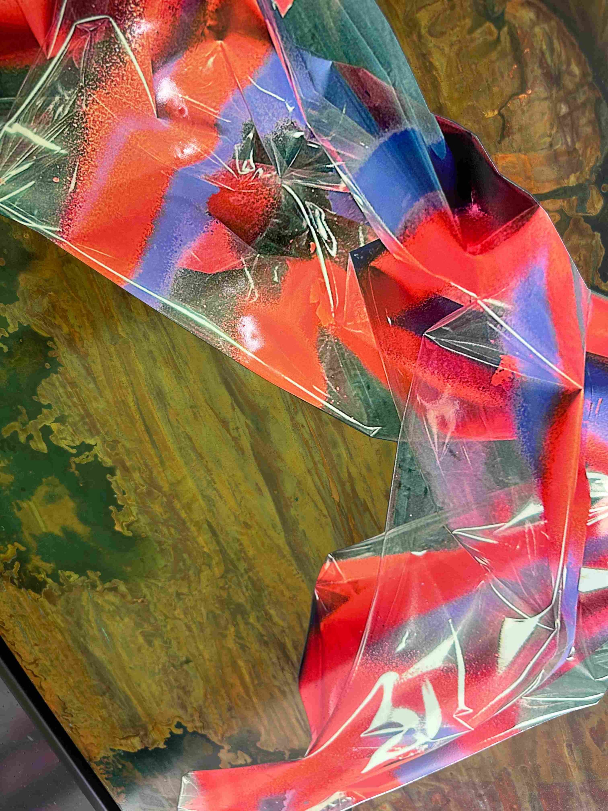 Cellophane plastic transformed into abstract alien landscapes. This large-scale piece explores otherworldly forms through spray paint and oxidised copper.