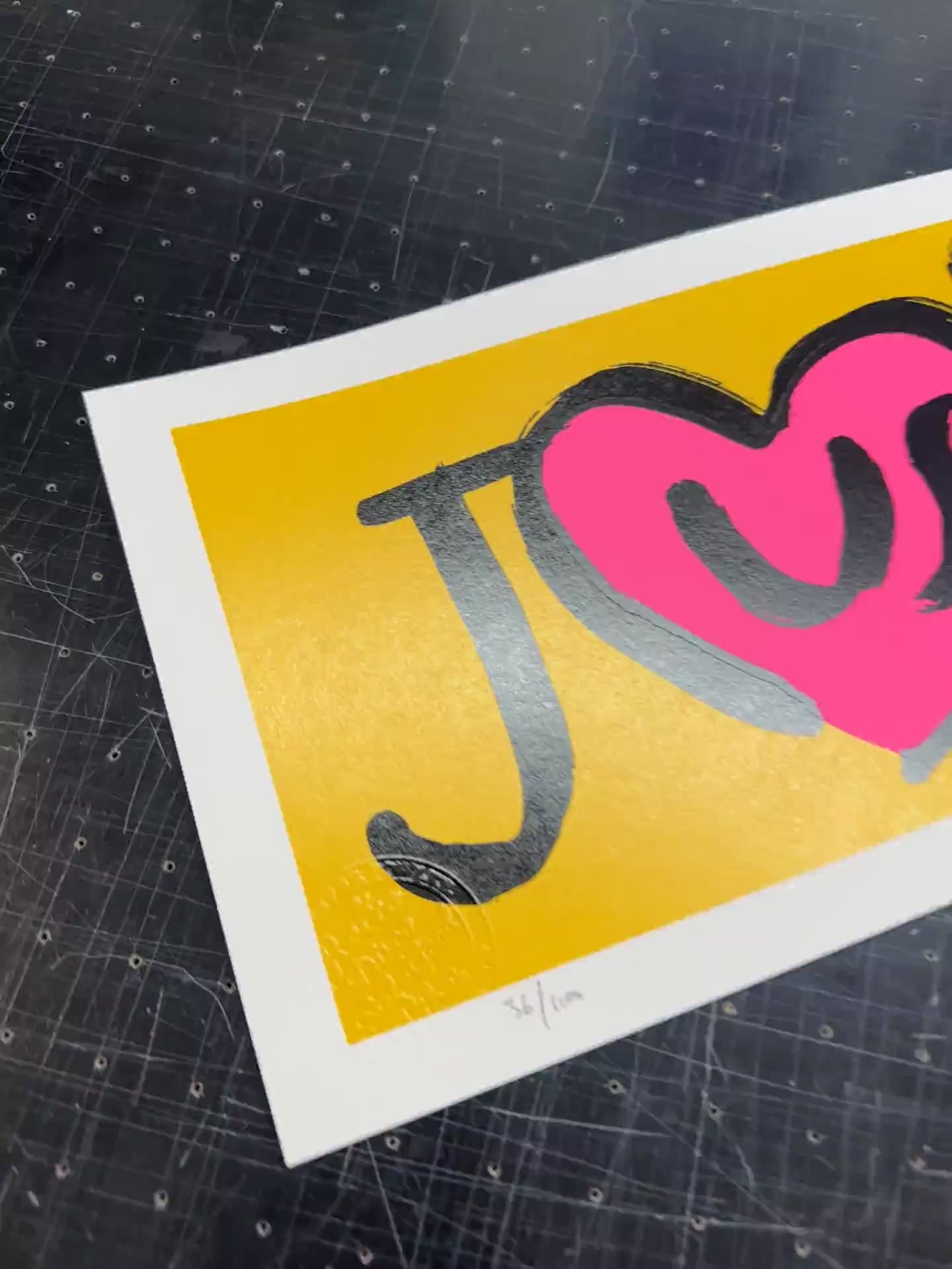 - Hand-pulled screenprint with fluorescent pink and metallic leaf