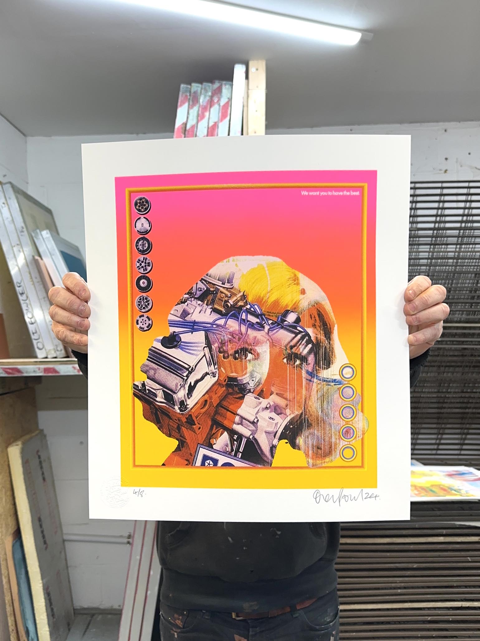 5-layer stochastic hand-pulled screenprint with fluorescent fade. 380 x 450mm, 400gsm Munken Smooth. Limited edition of 8, signed and embossed. Rare. Sold unframed.