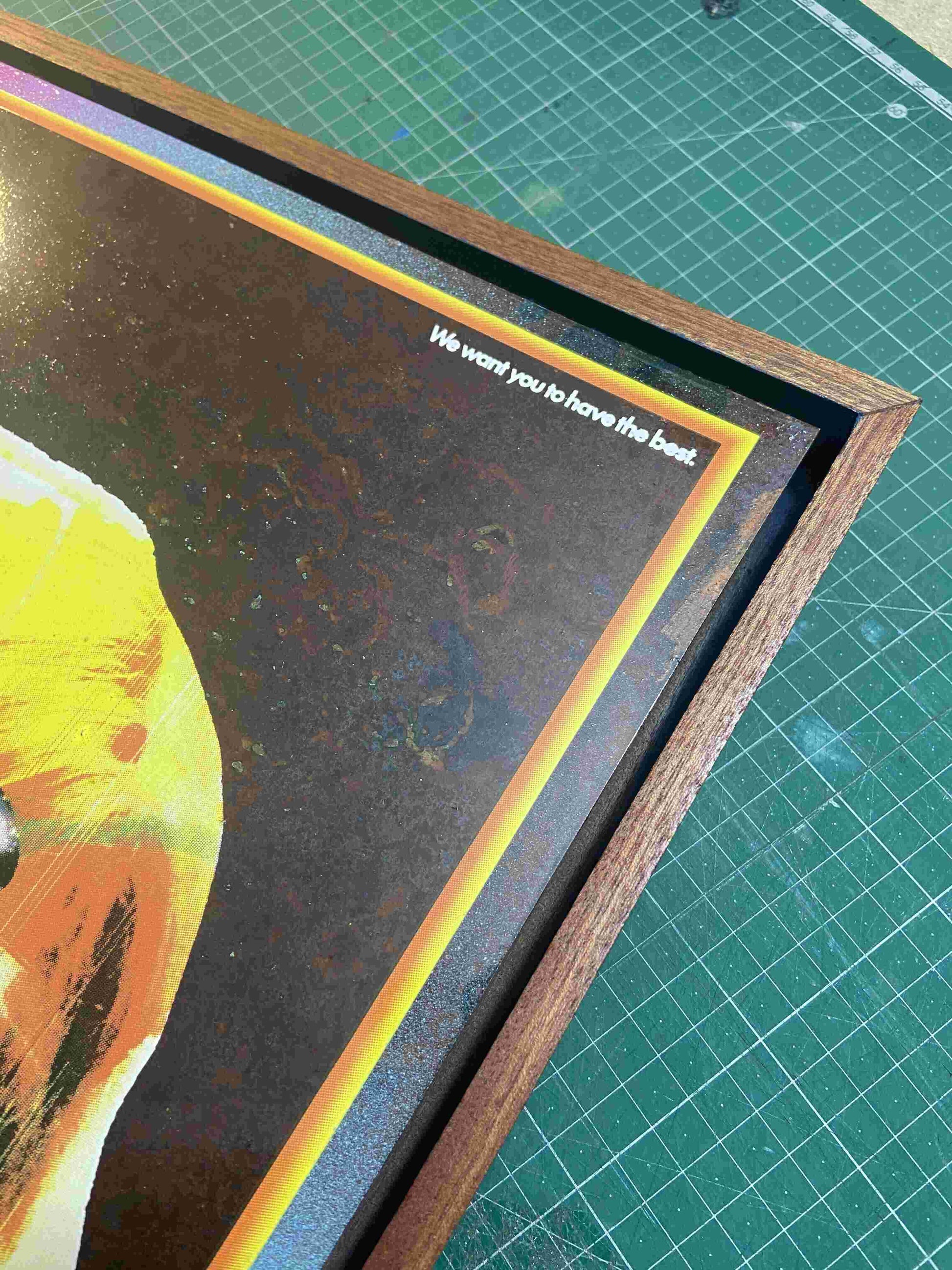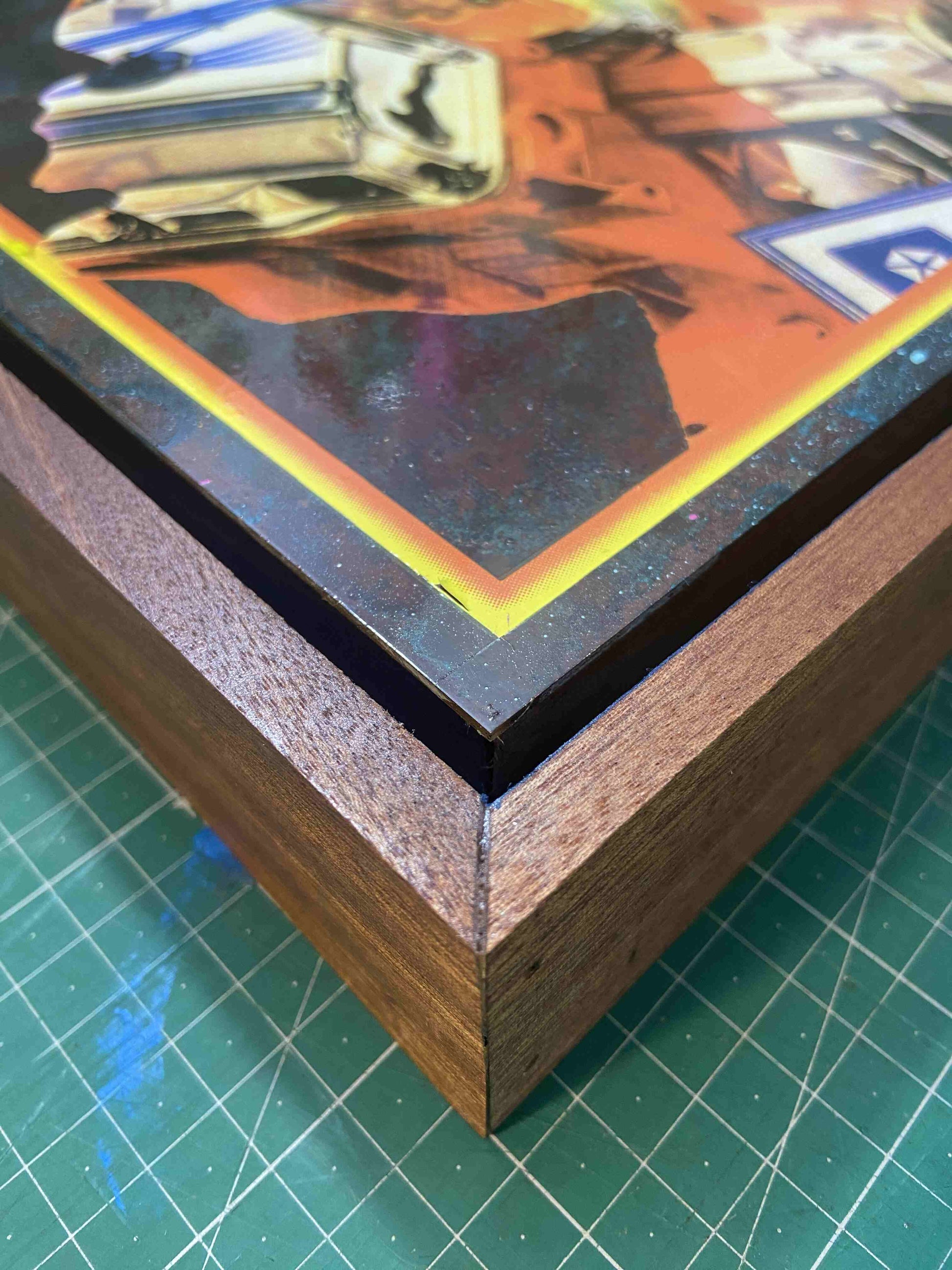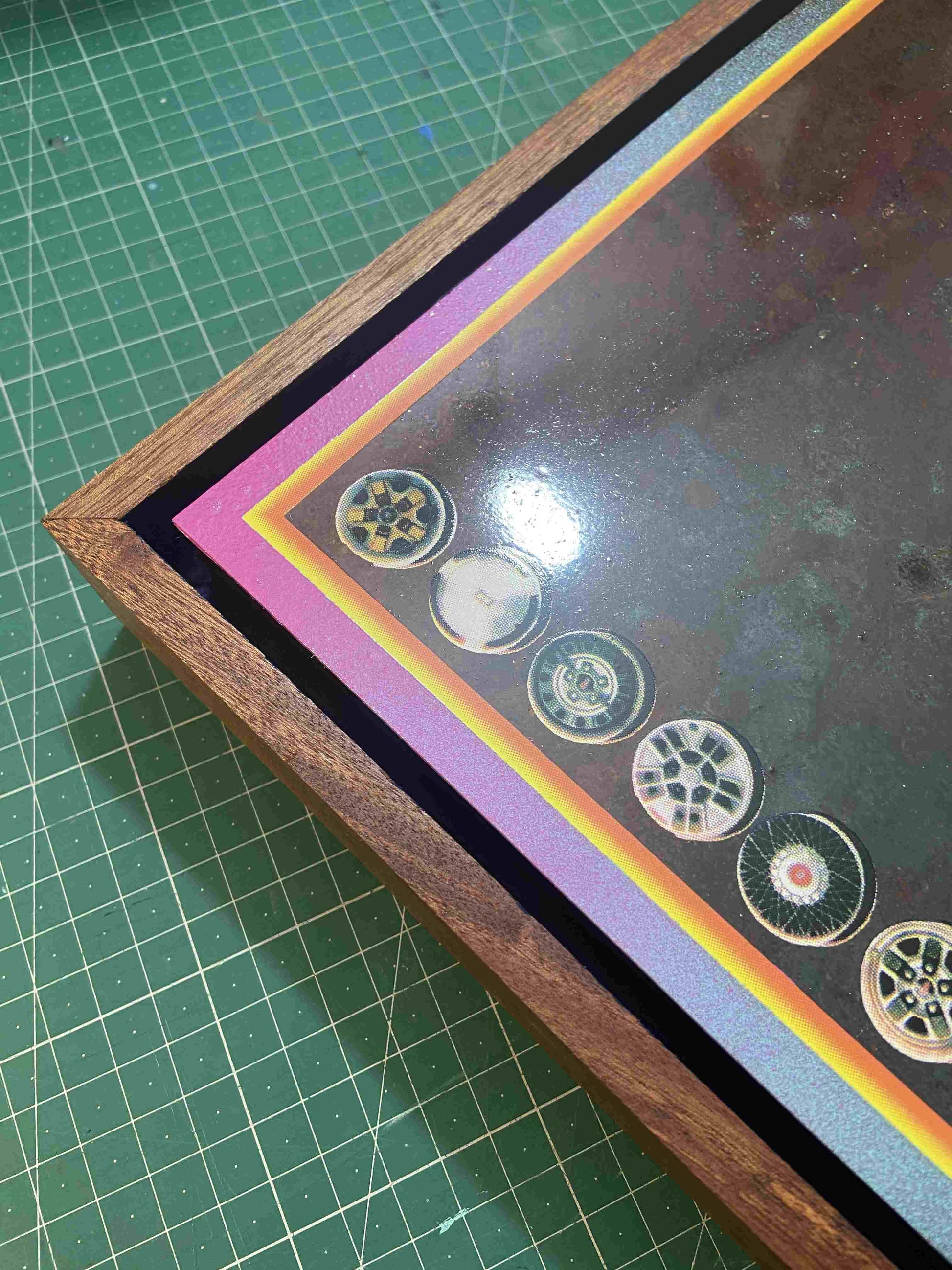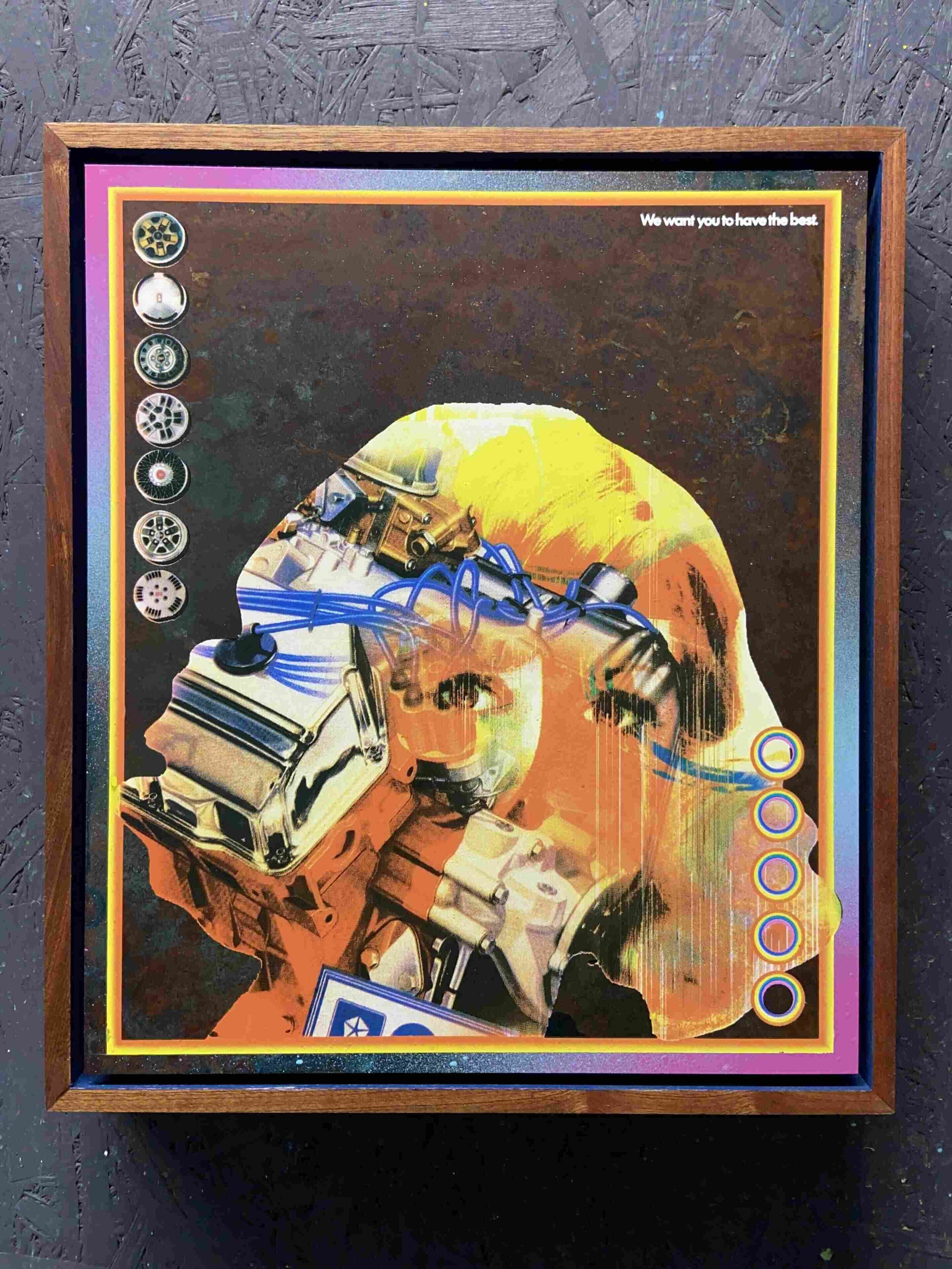 Original 7-layer screenprint on oxidised copper with varnish overlays and spray painted elements. Framed in hardwood tray frame, 385 x 335 x 50mm. One-off original artwork, signed by artist. Ready to hang.