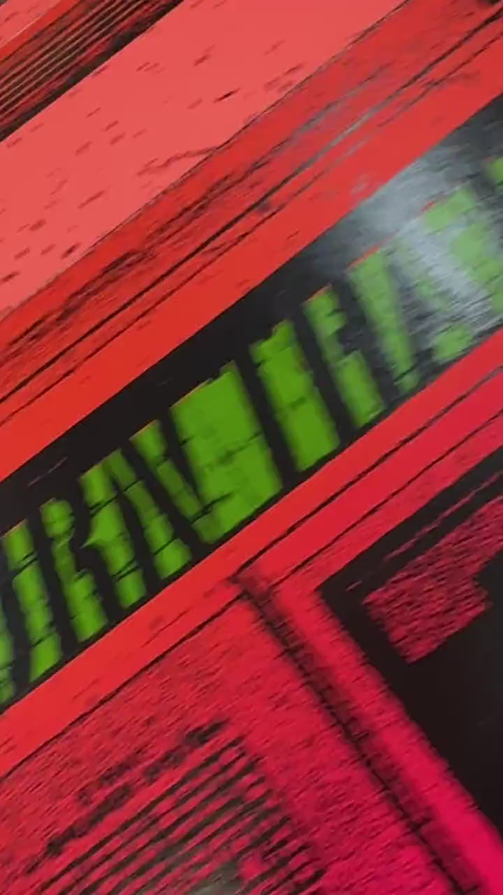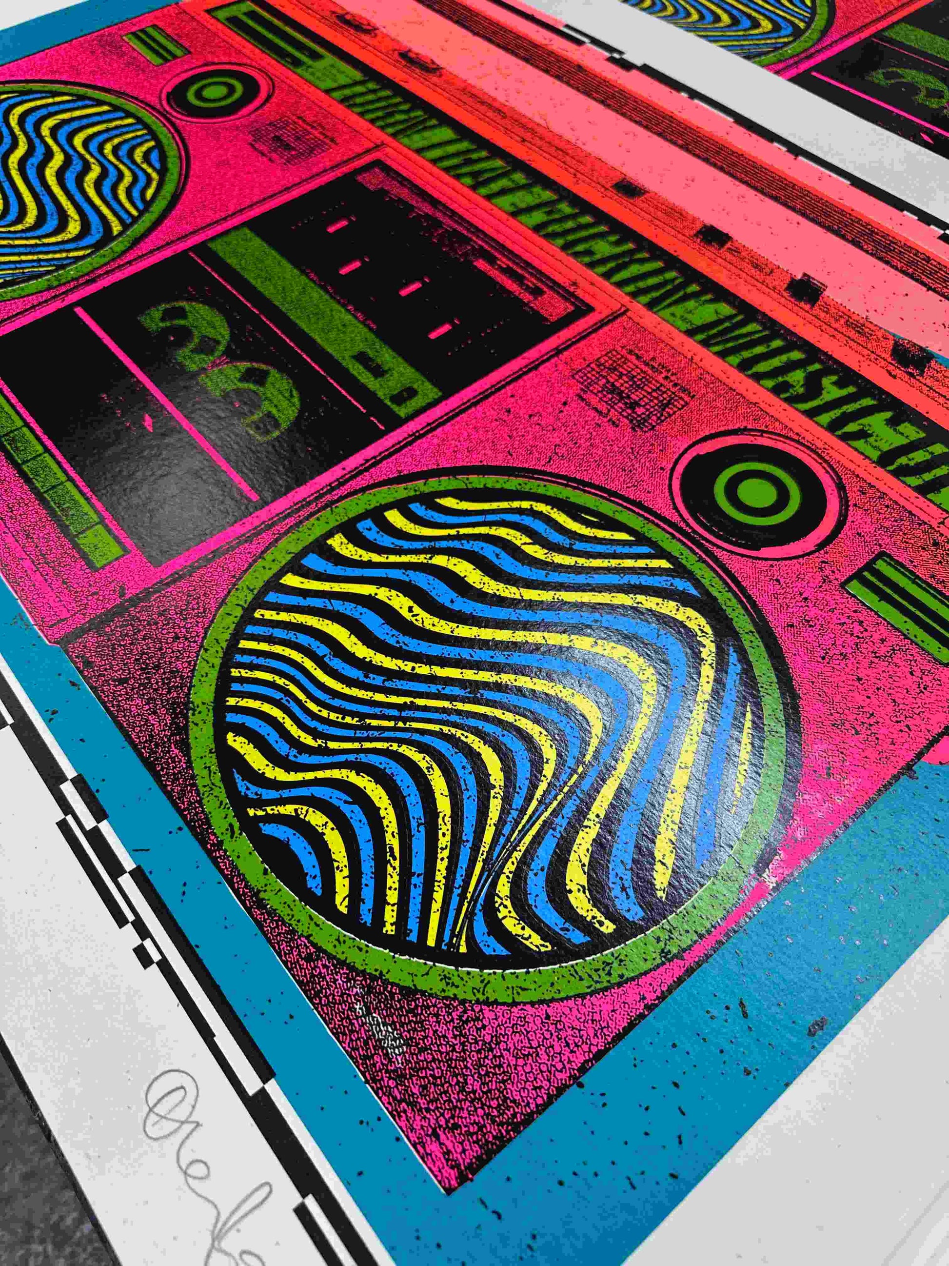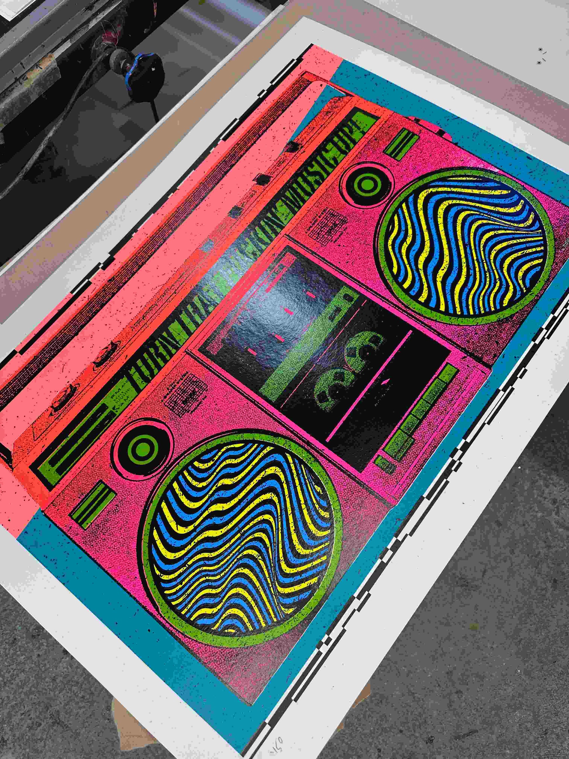 XL boombox screenprint. Six layers of hand-pulled ink with fluorescent colours on recycled paper.
