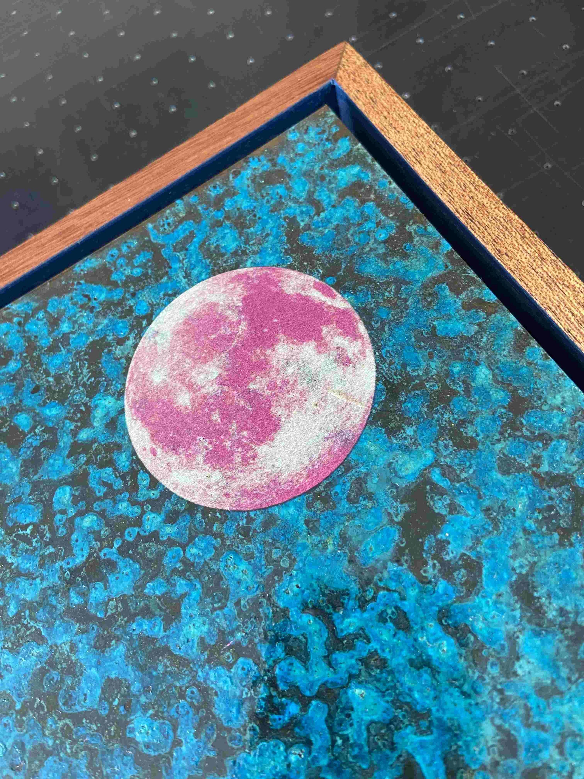- 5-layer print on oxidised copper with varnish overlays
