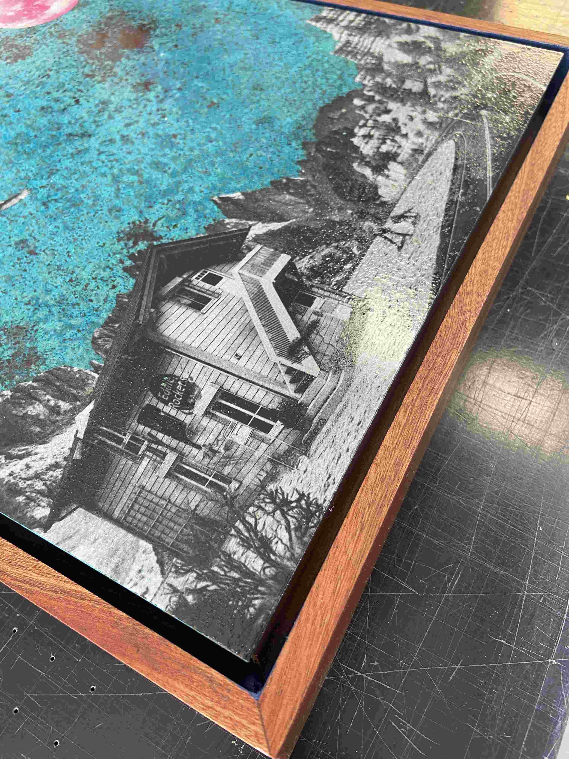A winding road, a boy and his dog. The oxidised copper background captures time passing, while the collage elements tell a fragmented story of the journey. This piece is about exploration and the paths we take.