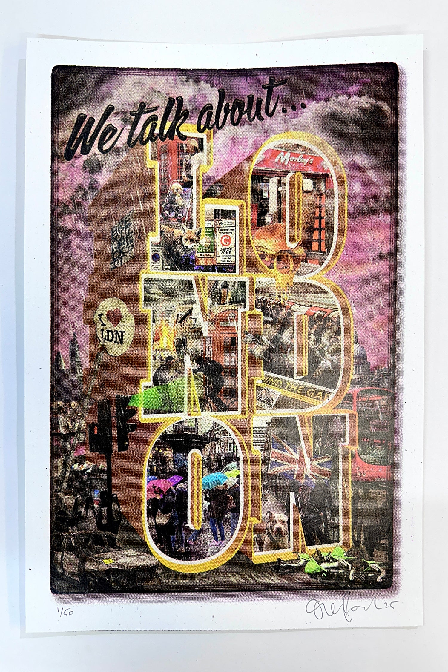 A collage of London's chaos – red buses, tube signs, urban foxes, pigeons. The city's story in distressed texture and retro-future aesthetic.